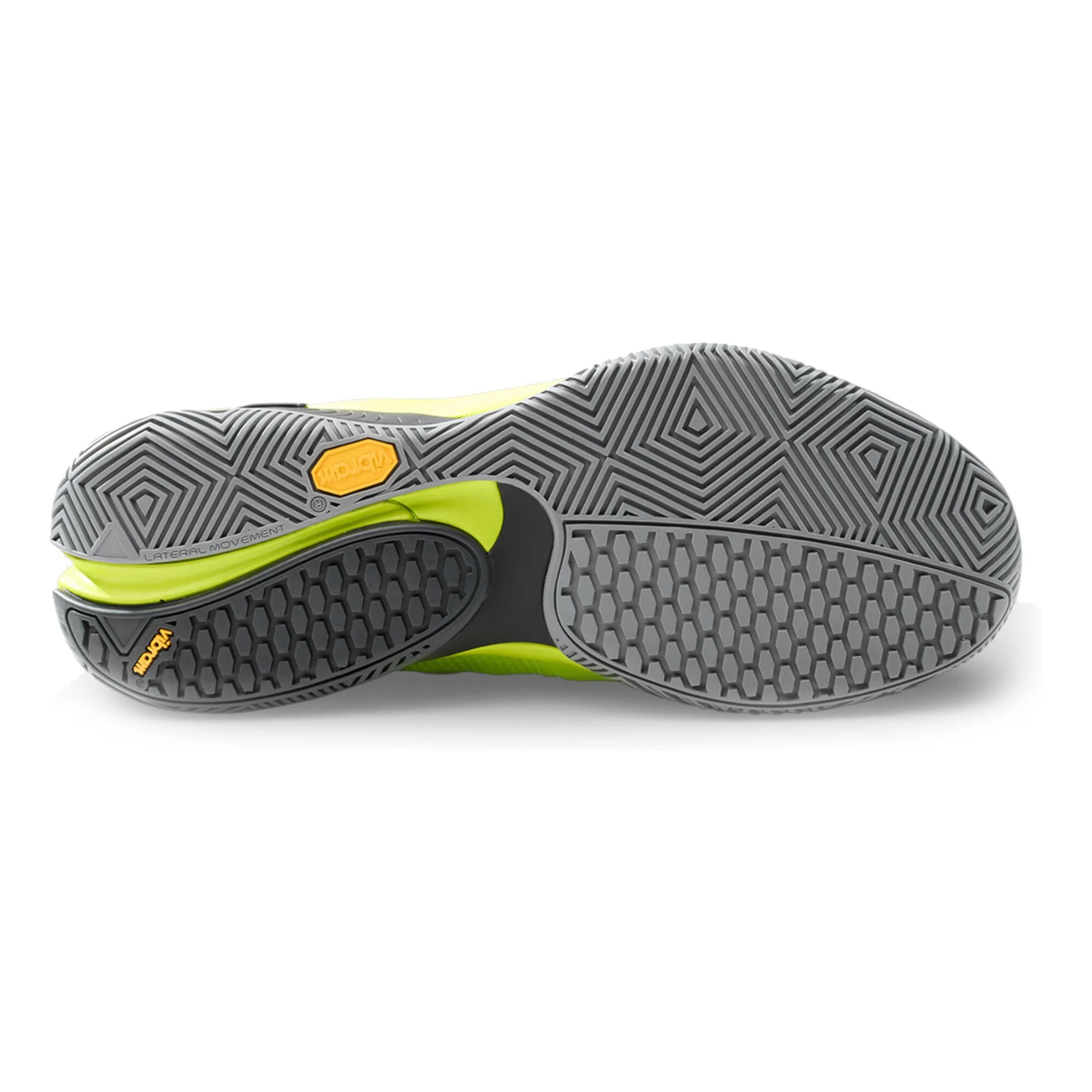 • Suela Vibram con tracción avanzada: Compuesto de goma de alta adherencia que proporciona agarre seguro en cada apoyo, facilitando movimientos laterales rápidos, cambios de dirección precisos y frenadas controladas, incluso en pistas con polvo de sílice.