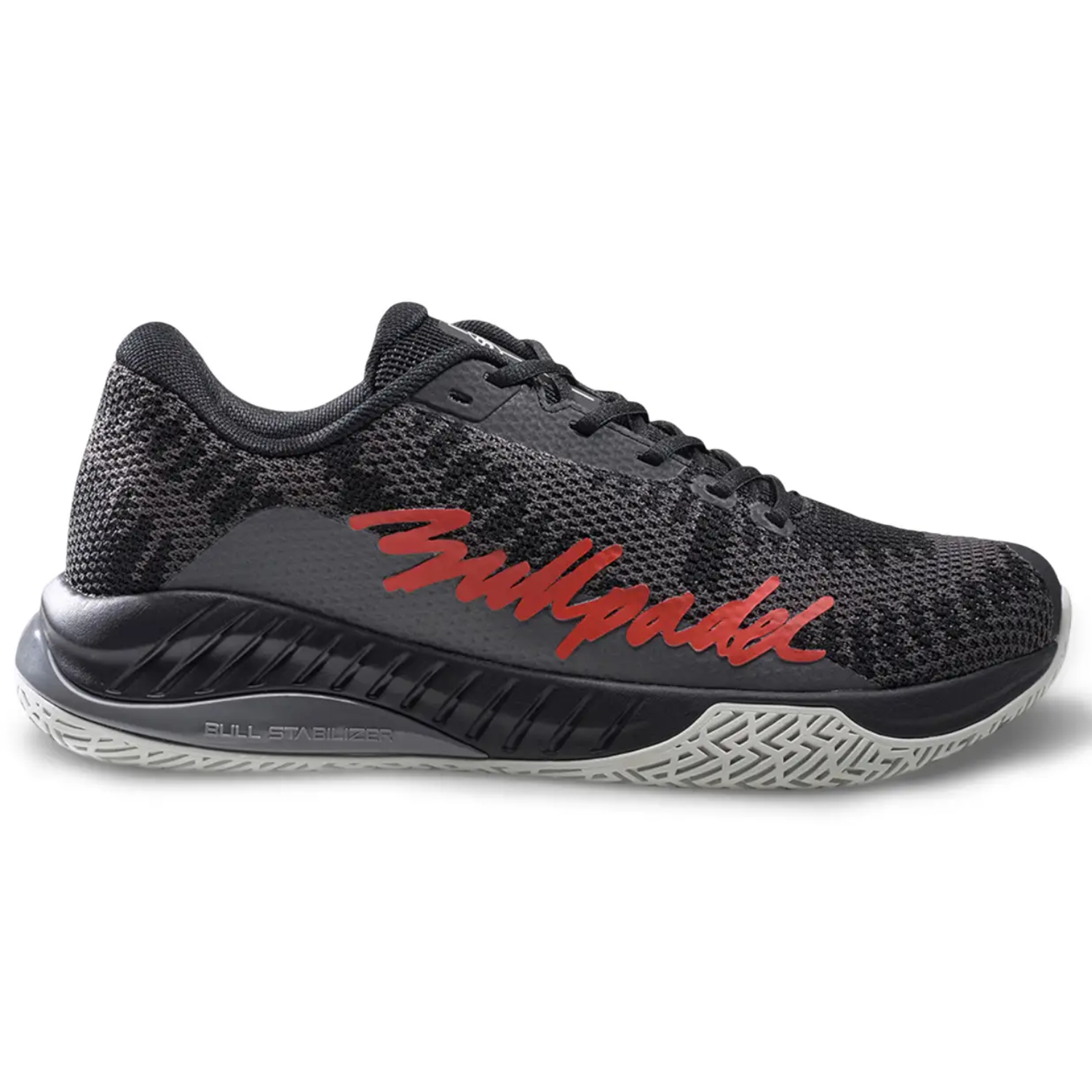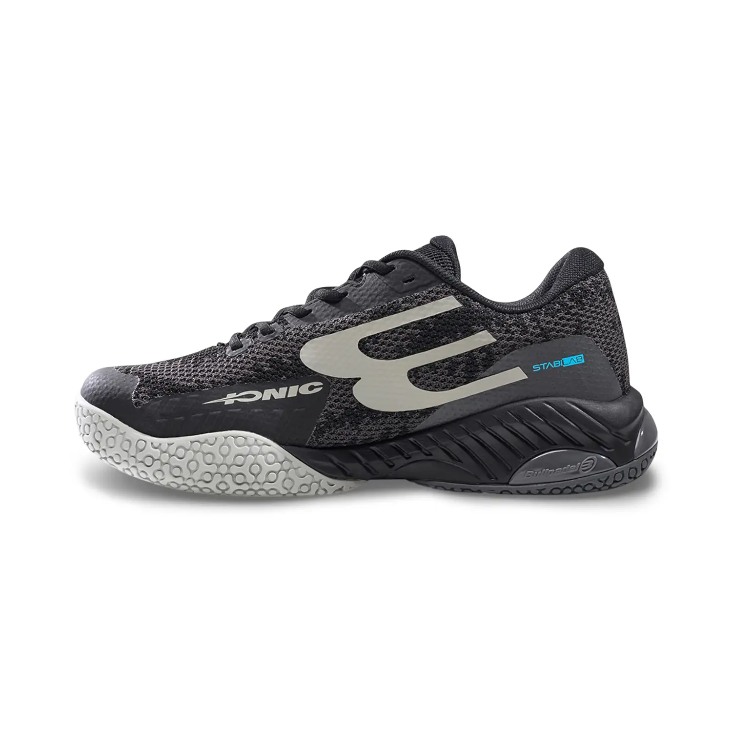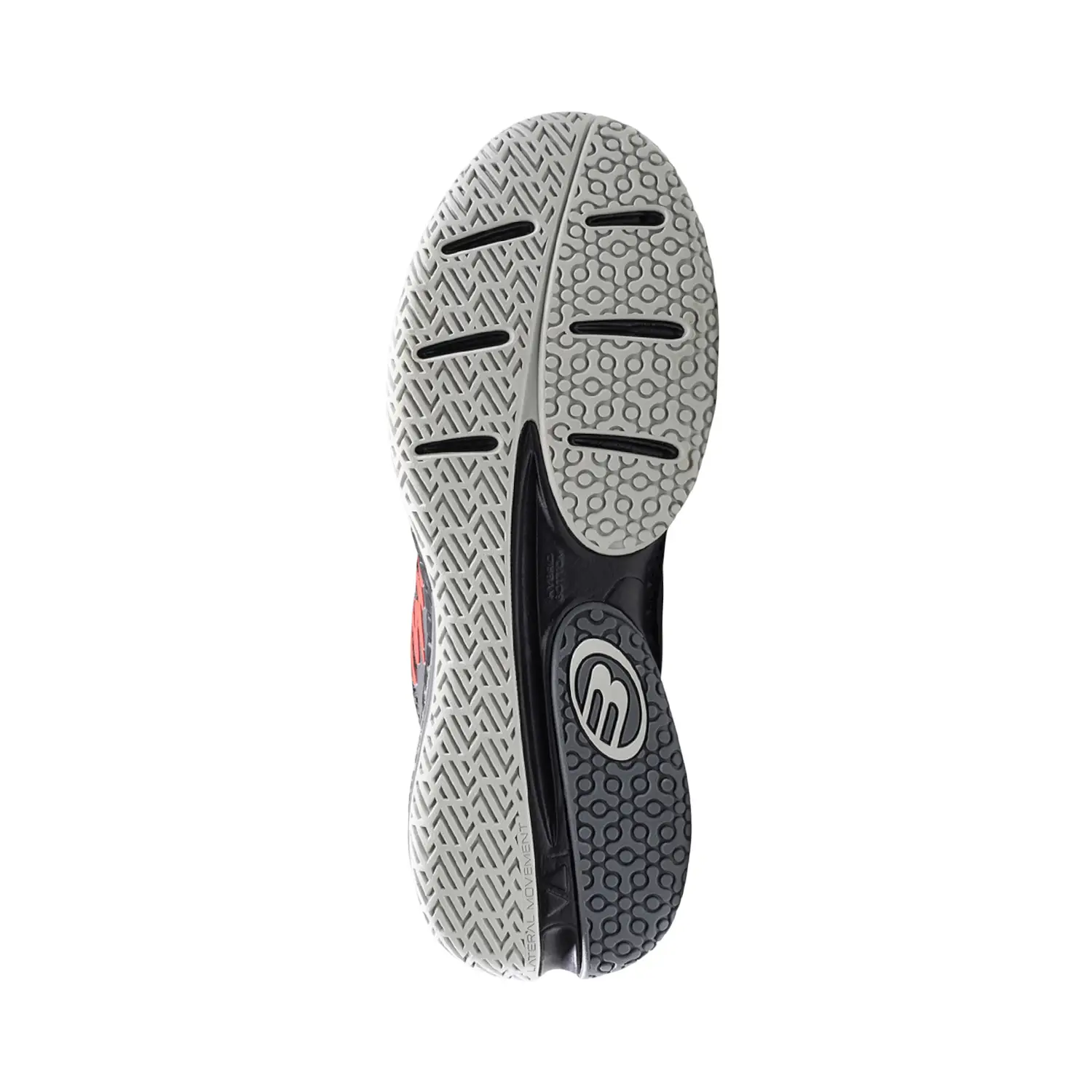 Suela con dibujo específico para pádel: Compuesto de goma con patrón optimizado que proporciona agarre y tracción fiables durante movimientos laterales, giros y apoyos rápidos.